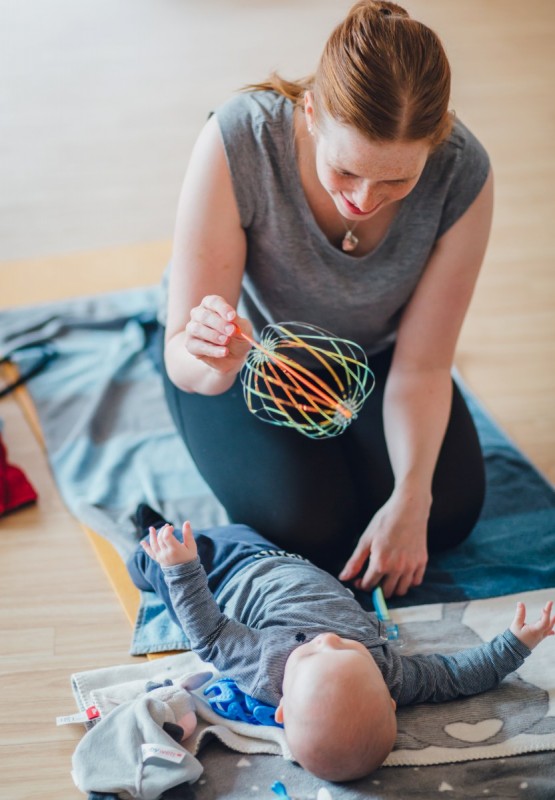 Motorik, Rhythmik und soziale Kontakte der Babys werden gefördert. Freude an Bewegung und ein entspannter Austausch in der Gruppe auch für die Mamas stehen an erster Stelle.